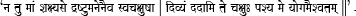 the Prime Existence is no a theorem, an idea proposed and accepted as true; liker love it is an experience to be experienced. In mathematics and physics there are theorems and theories. Spiritual enlightenment is an experience and not a theory. Intekkect and intelligence are only means and not the end. Krishna knows that neither words can communicate the divine resplendence nor human empirical eyes can acvcess it . Therefore Krishna offers him spiritual eye saying –![]()